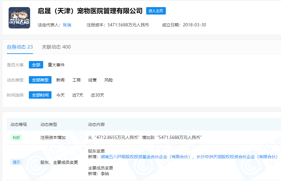 企查查APP显示,启晟(天津)宠物医院管理有限公司(萌兽医馆)于近日发生工商变更,新增股东湖南五八阡陌股权投资基金合伙企业(有限合伙)(58产业基金)等公司,同时该公司注册资本由4712.8655万元增加至5471.5688万元,增加16.1%。企查查融资信息显示,萌兽医馆共完成2轮融资,投资方包括经纬中国、红杉资本等。